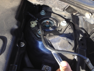 この車ストラットの交換をしています。もしやとチェックすると左ストラットの取り付けボルトが締め付けられていない。交換時に仮止めのままでした(はぁ~)。これにて解消。やがてダメになるスタビリンクは予防交換と納得させて・・・。