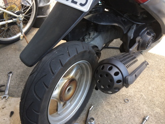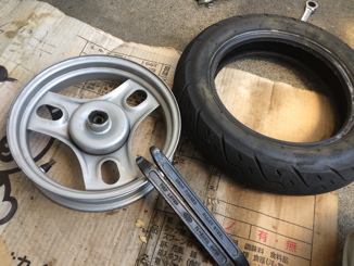 すり減ったタイヤはさすがに危険で交換です。 まずは前から。ホイールごと外してタイヤレバー2本で抜けました。 バルブは空気を入れやすいようにL型のものに交換です。 新しいタイヤを入れて空気を張ります。 新しいタイヤはブリヂストンのHOOP。 リアタイヤはマフラーをズラして外します。こっちは外れにくくタイトでした。 よく見ると前後違います。右がフロント、左がリア。どっちも溝はありませんが・・・。交換して一安心です。 走行距離 5853km