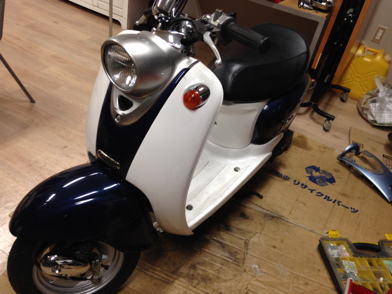 パーツの補修が終わりましたので、掃除をして組み付けていきます。カウル類を外したフレームですが、錆があるので、シャーシブラックを吹きます。 さっぱりしました。 フロント周りもキレイに磨きます。 カウル類はレッグシールドが新品、他ステップボードとライトカウル以外は中古の程度のよいものを用意しておきました。 ハンドル回りもパーツを全バラして磨きあげましたので、ピカピカです。
