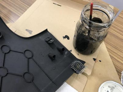続いてパネルの補修。固定部が割れている箇所が数カ所あります。ABS製なので、割れた箇所をABSで作成し、ABSをアセトンで溶かしたものを塗りたくります。さらに、金網を熱したものを埋め込み、さらにABSの溶液を塗り固めます。