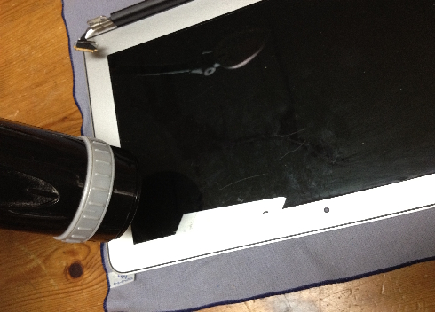 丁寧にやる。上側のカメラのある周辺。その左側はカメラの制御基板があるので、そこに刃が当たらないように気をつけなければならない。