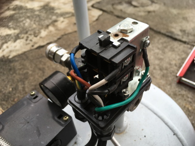 コンプレッサーの圧力スイッチの故障で、空気漏れ。だましだまし、スイッチを入切繰り返すとどうにか使えていたのだが、アマゾンで圧力スイッチを見つけたので交換することにしました。