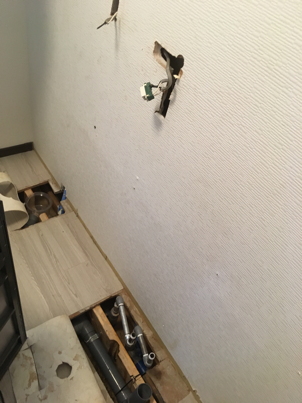 洗面台を撤去すると、そこには、冷水、温水、排水の3つの配管があります。