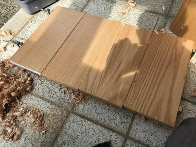 仕上げです。 古材ですから、溝があります。ここは、同じ材料で埋めます。 カンナで削り込んで こんな仕上がりです。 棚板の表の小口が見えるので、薄くスライスした板を貼ってハタガネで圧着します。その後、カンナとサンダーで仕上げます。最期に木地の出ているところにウレタンニスをかけて完成です! いい書棚ができました!